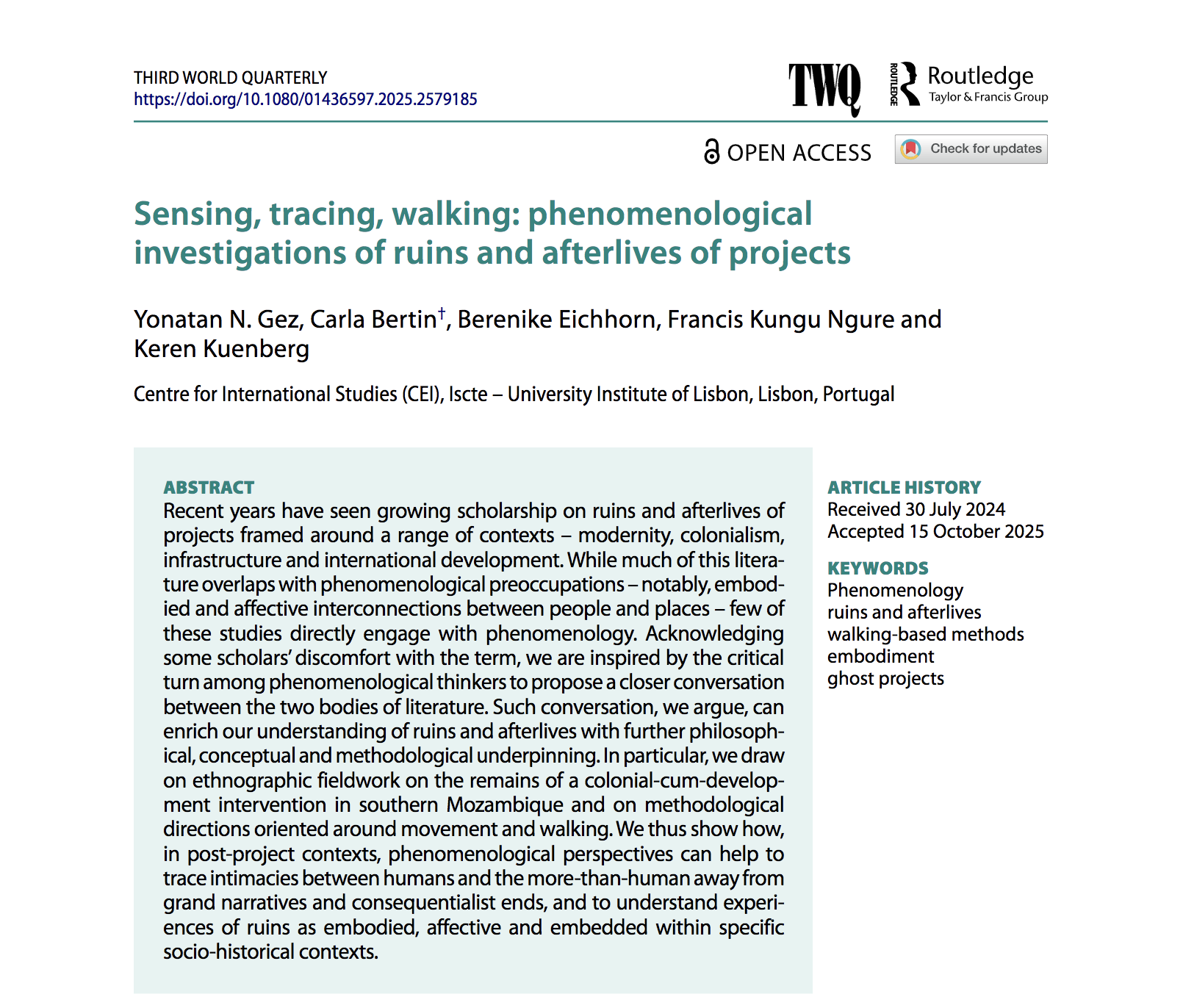 Our new article in the journal Third World Quarterly is out. It brings phenomenology into conversation with research on ruins and afterlives of development, drawing on fieldwork in southern Mozambique. We explore how embodied and affective encounters with post-project places can deepen understandings of their socio-historical and more-than-human dynamics.